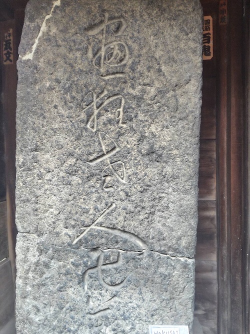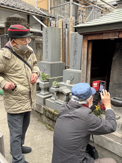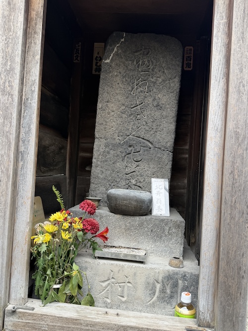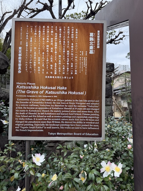 ​この石碑は、東京都台東区元浅草にある誓教寺(せいきょうじ)にある北斎の墓石です。よく見ると、石の中ほどに横に亀裂が入っていますが、これは大正時代に関東大震災で被災した際のものと言われています。