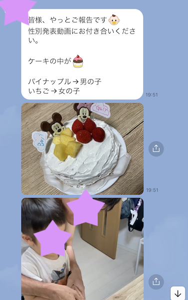 で 家族ラインに このジェンダーリビールケーキの動画の発表がありました。